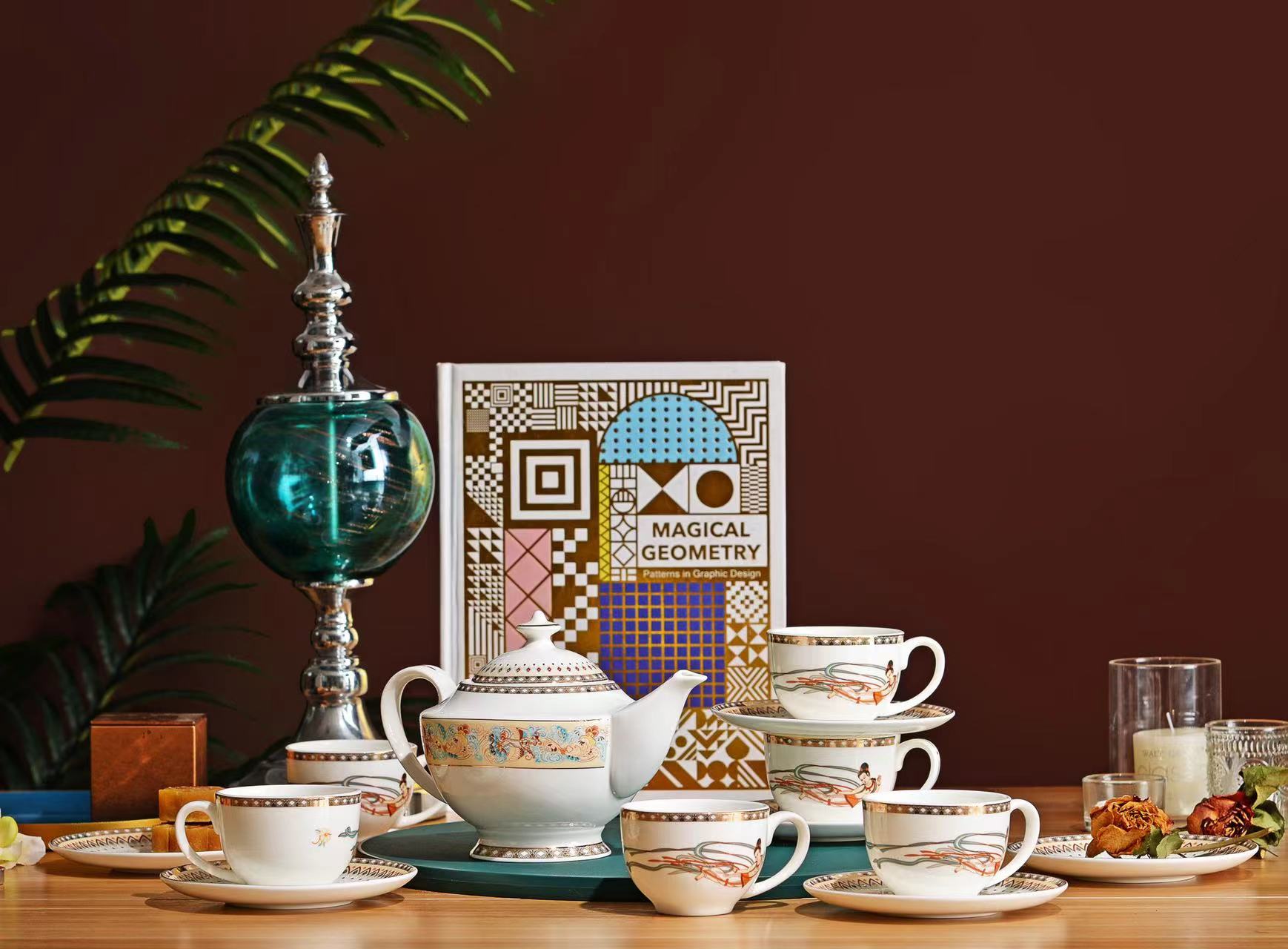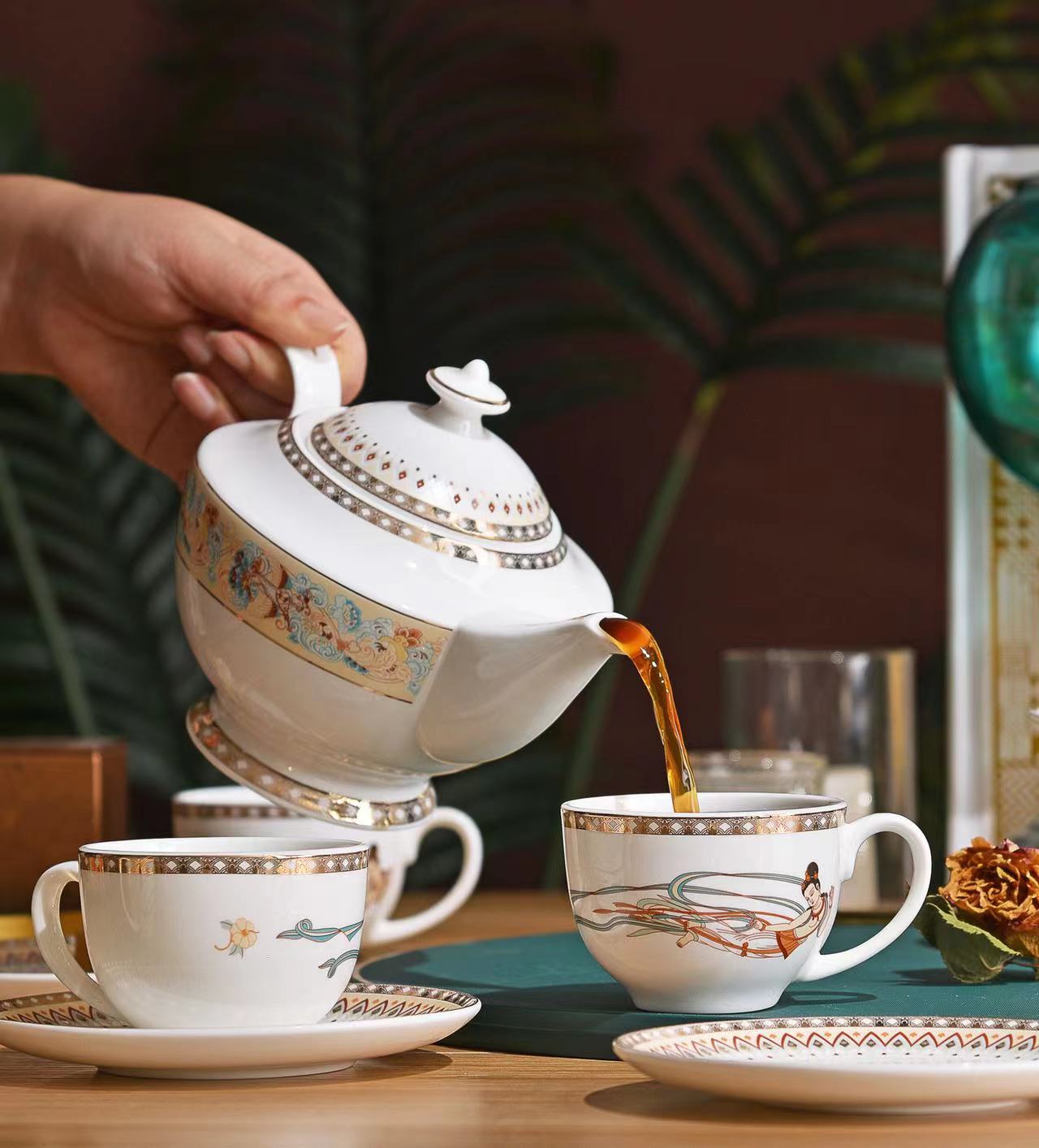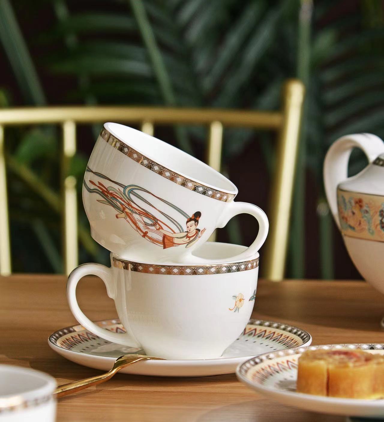 飞天系列作为2016丝绸之路国际文化博览会用瓷,以敦煌壁画为原型创作。近两千年的敦煌文化的厚重感,捧在手心,相伴三餐。华夏文明古香古色的美,篆刻在餐盘之上。以美食美器,回味神秘敦煌,国风当道,带你穿越千年食光。