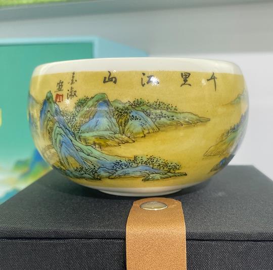 【简 介】: 《千里江山图》是北宋王希孟创作的绢本设色画,现收藏于北京故宫博物院。以古画为基石乾坤大魔移,灵魂复刻到茶喽杯!传承陶瓷文化!这是瓷都能工巧匠之使命!