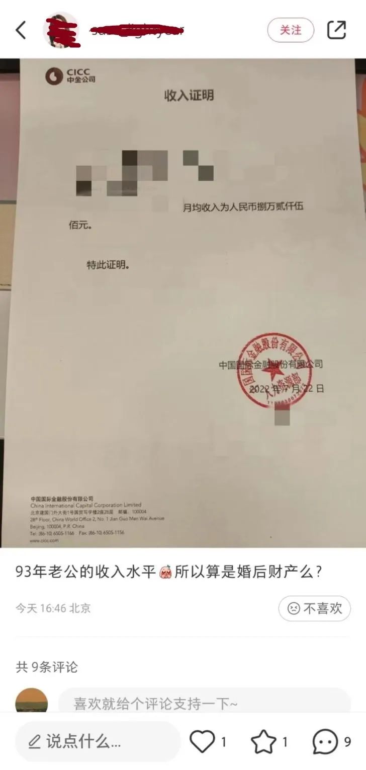 网传中金公司(43.050, -0.37, -0.85%)一名交易员的夫人晒出了其夫的收入证明,该证明显示其月均收入为82500元。这位夫人问:“93年老公的收入水平,所以算婚后财产吗?”