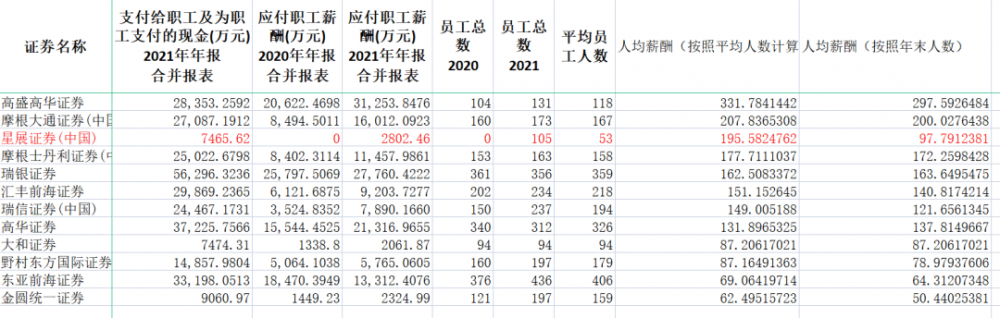 不过,一些抢滩中国市场的外资投行薪酬更高。今年6月,《每日经济新闻》记者曾经做过统计,高盛高华、摩根大通证券(中国)两家外资券商2021年人均薪酬均超过200万元。摩根士丹利证券(中国)、瑞银证券、汇丰前海证券、高华证券、瑞信证券(中国)人均薪酬也超过百万。