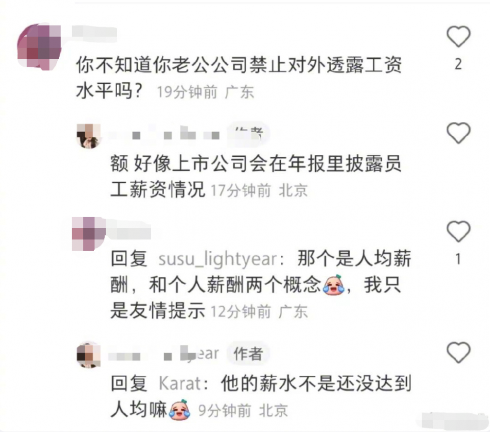 不过,她的行为也遭到了网友的议论。有网友提醒:你不知道你老公公司禁止对外透露工资水平吗?她回复:好像上市公司会在年报里披露员工工资情况,并轻微吐槽:“他的薪水不是还没达到人均嘛”。
