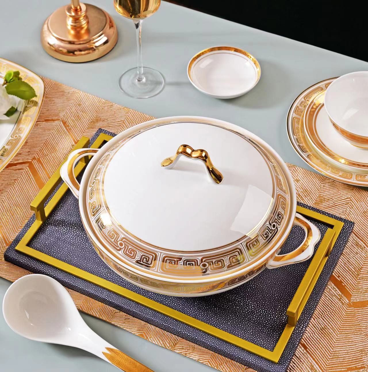 青铜时代为2016年杭州G20峰会用瓷,是以中国传统文纹样与浮雕金相结合制作。捧在手心,相伴三餐,华夏文明的美,篆刻在餐盘之上。高贵奢华、大气典雅,与您一起相伴美好食光。