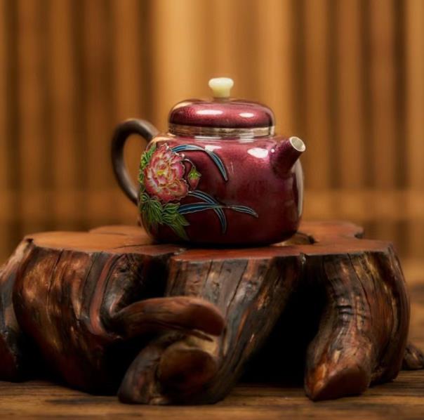 银胎,七宝烧釉色,檀木柄,玉石摘钮
